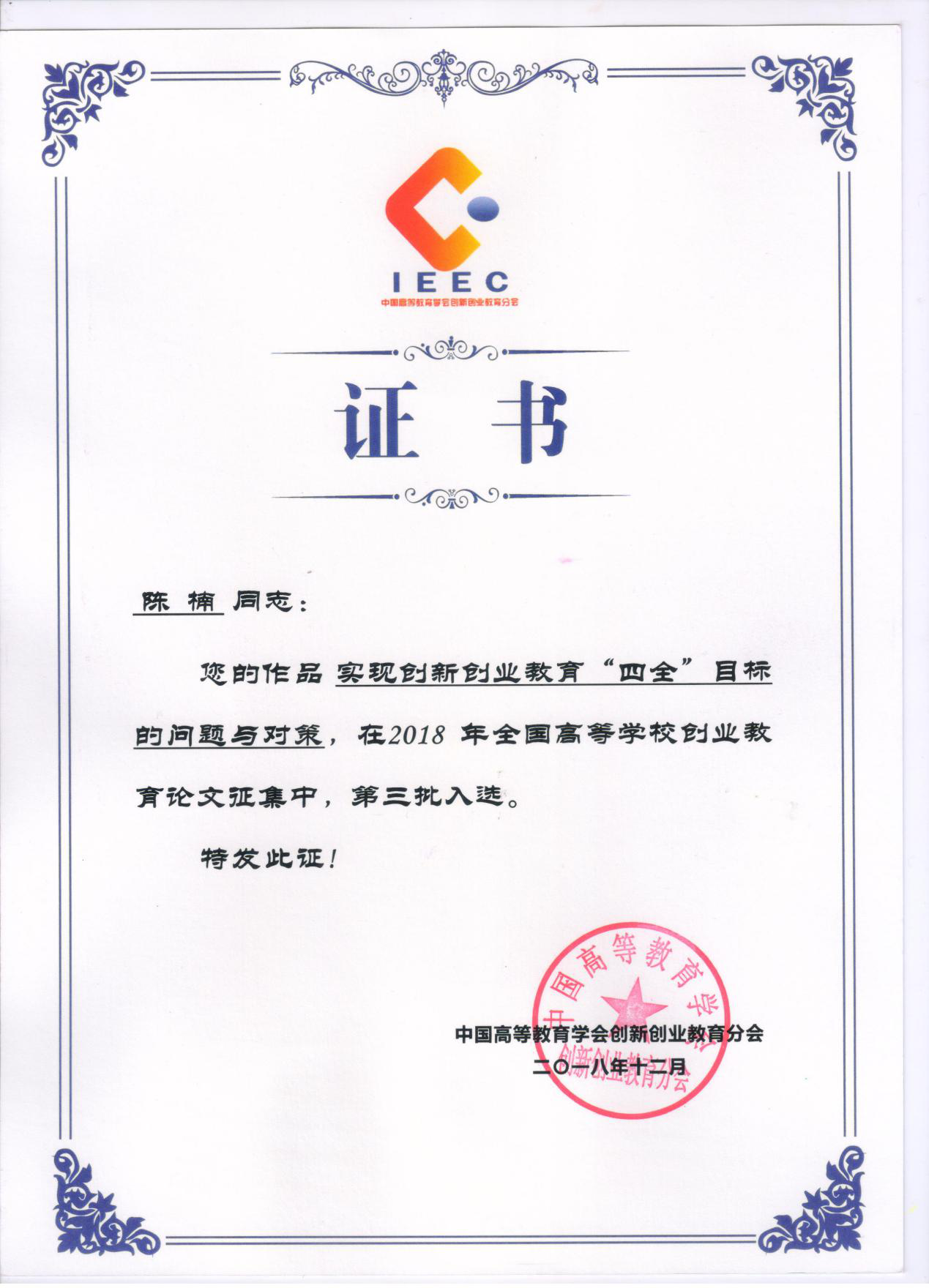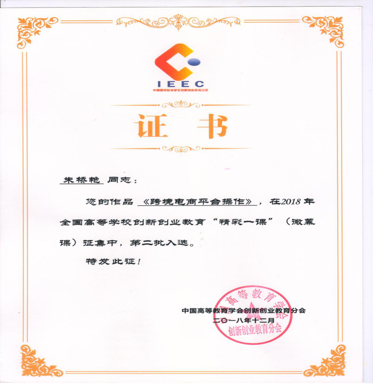 2018年全国高等学校创业教育论文/微慕课征集入选证书 |