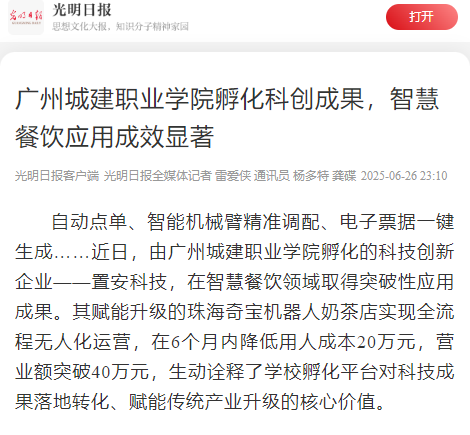 自动点单、智能机械臂精准调配、电子票据一键生成……近日,由广州城建职业学院孵化的科技创新企业——置安科技,在智慧餐饮领域取得突破性应用成果。其赋能升级的珠海奇宝机器人奶茶店实现全流程无人化运营,在6个月内降低用人成本20万元,营业额突破40万元,生动诠释了学校孵化平台对科技成果落地转化、赋能传统产业升级的核心价值。