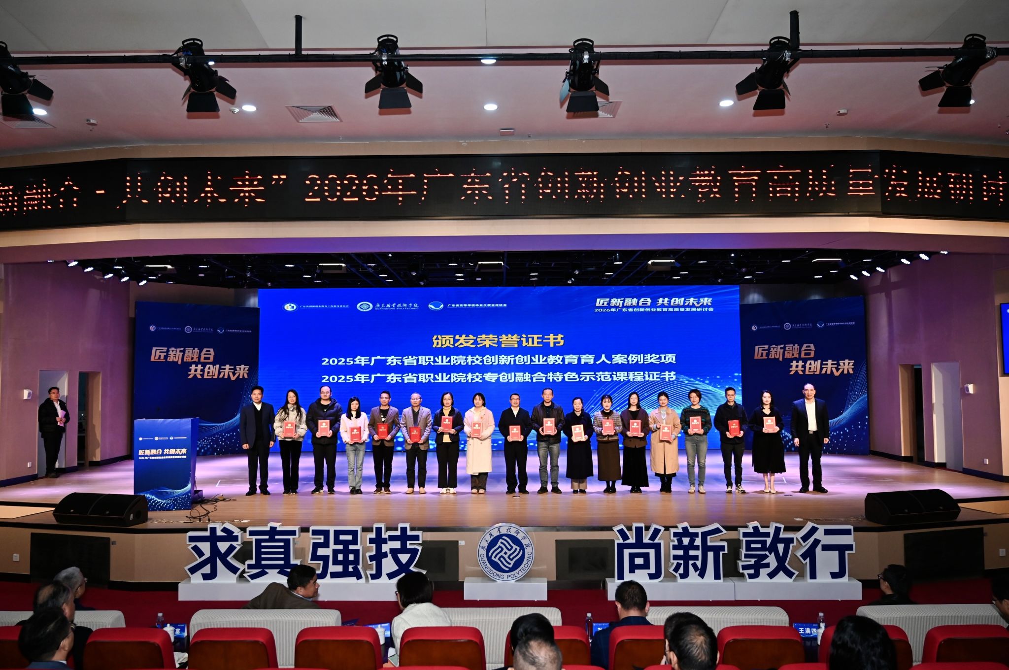 1月6日,“匠新融合·共创未来”2026年广东省创新创业教育高质量发展研讨会在广东职业技术学院(高明校区)成功举办。我校申报的《职业发展与就业指导》《Unity 3D交互设计》《传统图案与文创应用》三门课程经过层层评审,成功入选2025年广东省职业院校专创融合特色示范课程;学校校长助理邱漠河以及刘冬娜,胡锦玲,叶诗蕴等三位老师入选示范课程教师。