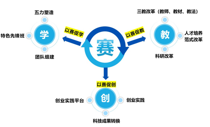 以创新创业大赛为切入点,“赛学教创、四位一体”把创新创业融入人才培养全过程。以赛促学,激发学生的创造力,在创新创业中增长智慧才干,成长为德才兼备的有用人才;以赛促教,把大赛作为深化创新创业教育改革的重要抓手,推动人才培养范式深刻变革;以赛促创,搭建成果转化平台,推动赛事成果转化和产学研用紧密结合,形成“互联网+”新业态,实现毕业生更高质量的创业就业。