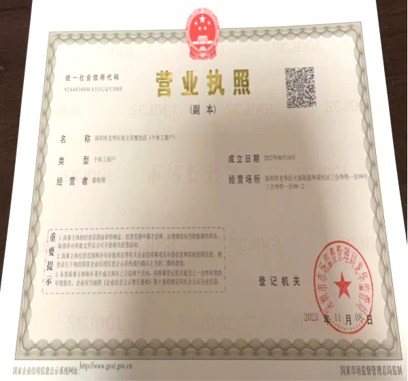 廖柏翔,男,广东省茂名市人,团员,2021物流管理班,2022年6月和朋友合伙创办深圳市龙华区海文哥餐饮店,担任总负责人。