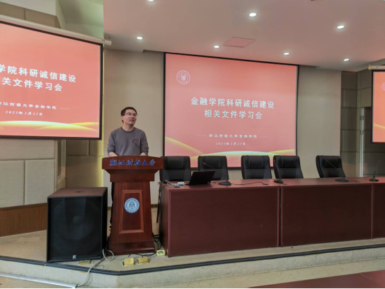 为贯彻落实习近平总书记关于科研作风学风建设的重要指示精神,加强学院科研诚信建设,营造风清气正的学术环境,3月27日下午,学院在3号楼200会议室召开了深入学习《浙江省科学技术厅关于进一步加强和改进科研作风学风建设工作的通知》《浙江省科研诚信评价与档案建设管理办法(试行)》《浙江省哲学社会科学科研诚信建设实施办法(暂行)》等文件精神专题学习会。会议由林祺副院长主持,学院全体教师参加会议。