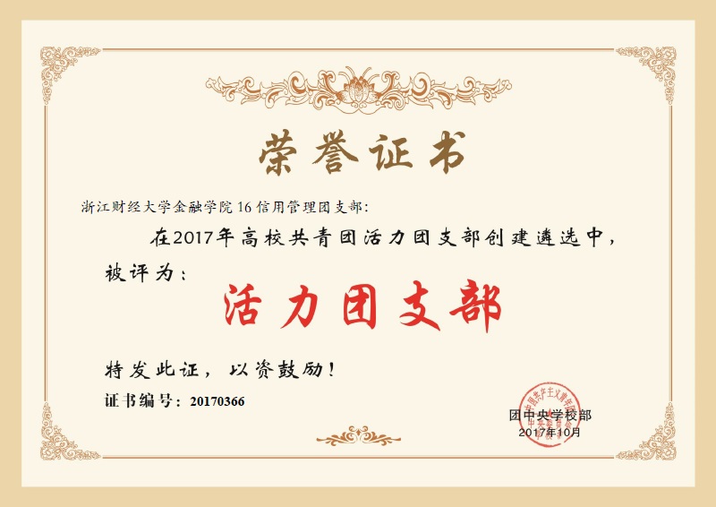 近日,团中央学校部公布了2017年全国高校“活力团支部”创建遴选结果。yl6776永利集团16信用管理团支部在全国优秀团支部中脱颖而出,荣获2017年全国高校“活力团支部”荣誉称号。
