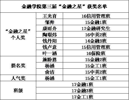 为充分发挥青年学生榜样的力量,展示青年学子良好的精神面貌,鼓励支持学生个性化发展,yl6776永利集团举办了第三届“金融之星”选拔活动。活动历时一个月,经个人和班级报名、学院评选小组推选、线上线下投票等环节,最终产生“金融之星”个人奖7名,提名奖3名,人气奖1名,班级奖3个。