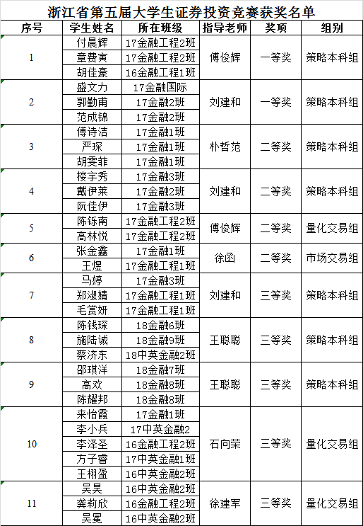 近日,浙江省第五届大学生证券投资竞赛总决赛在杭州电子科技大学落下帷幕。历经初赛、复赛、决赛的激烈角逐,我院学生在比赛中表现优异,获得喜人成绩。