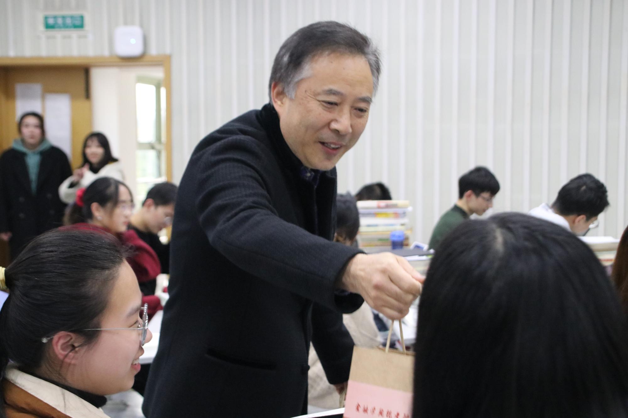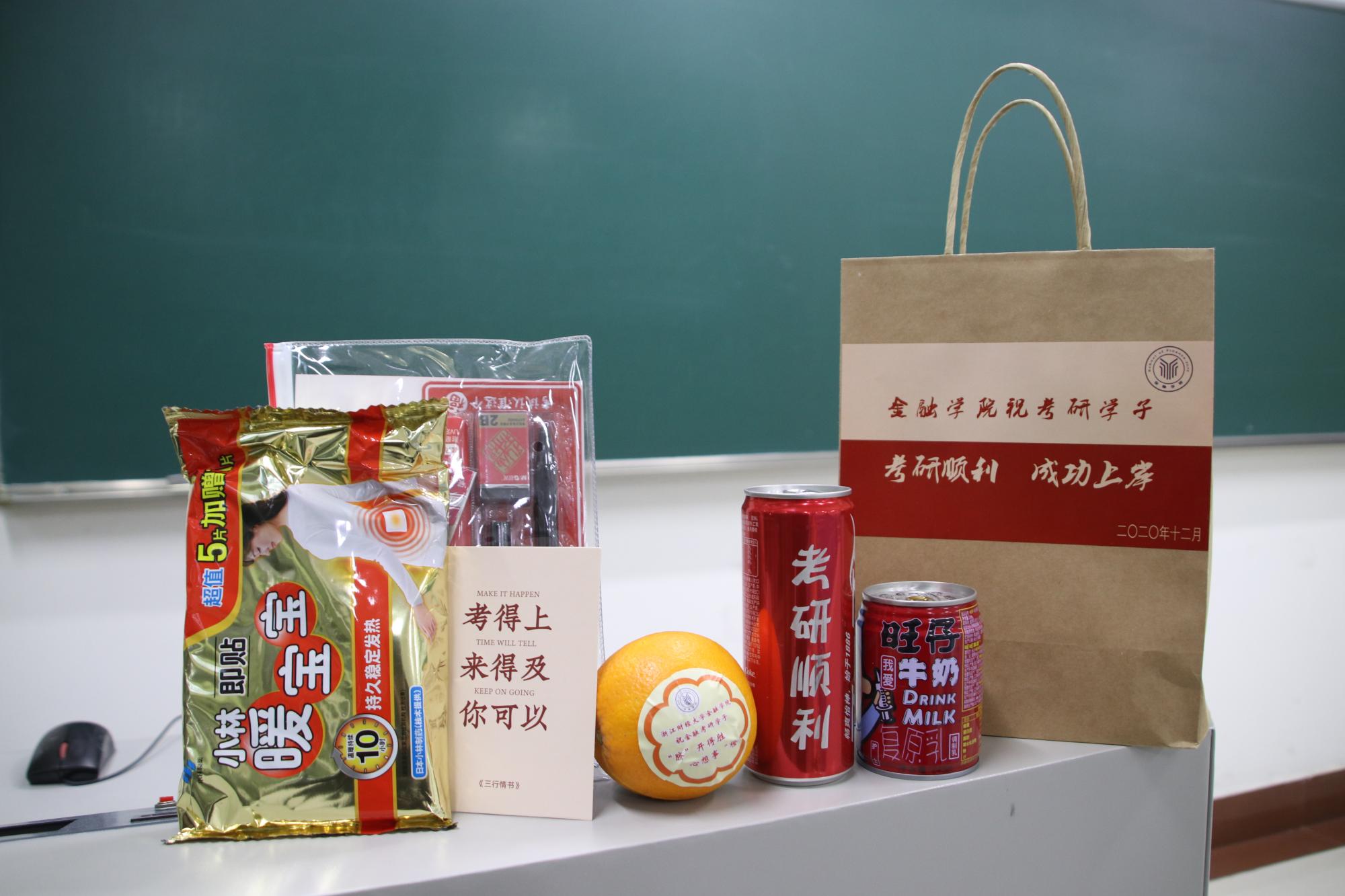 蔡书记代表学院勉励金融学子要坚定信念、端正心态、劳逸结合,提醒大家要注意天气变化,以最佳的精神状态迎接考试的到来,祝愿同学们都能够考取理想的院校。随后,老师们就同学们近期的学习、生活状况与大家进行了亲切交流,并送上了学院精心制作的“橙”功加油包,每一份加油包都饱含着学院对考研学子的深深祝福和殷切关怀,寓意“脐”开得胜,心想事“橙”。