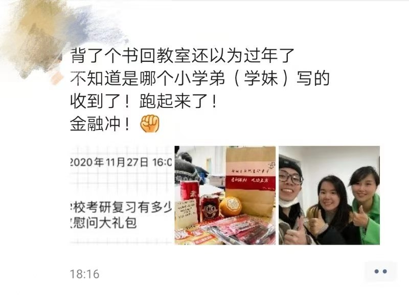 同学们纷纷表示,临考之际收到学院的考研加油包倍受感动鼓舞,感谢严寒冬日里学院的满满关怀与爱心,一定全力以赴向梦想奋进。