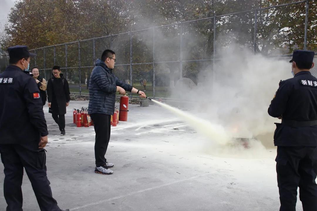 消防演练正式开始后,浙财安保人员向同学们详细介绍了灭火器的的使用方法,准确归纳了“看——拉——对——喷”四个要点:一看灭火器压力表是否处于正常压力区;二拉下拉环稳重握持;三握住喷口在离火源1.5米外对准火源;四喷射干粉直至火焰完全熄灭。介绍完成后,安保人员真实演示了干粉灭火器的使用步骤和方法。同学们认真观摩学习后实操尝试体验真实灭火过程,面对熊熊燃烧的火堆,学生们表现的十分沉着,按照灭火的步骤和方法,将燃起的浓烟大火成功的迅速扑灭,圆满完成了实操演练。