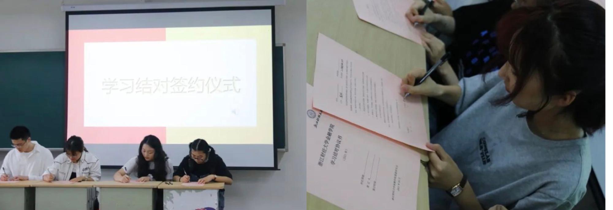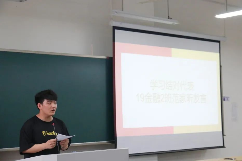 随后,进行了2021年学习结对签约仪式。前期共有一百余名同学报名参与此项活动,结对类别涉及考研、考公、考证、专业学习等多个方面, 10名结对学生代表上台签订了结对学习协议,2019级中英金融2班范家昕同学作为结对代表进行表态发言。