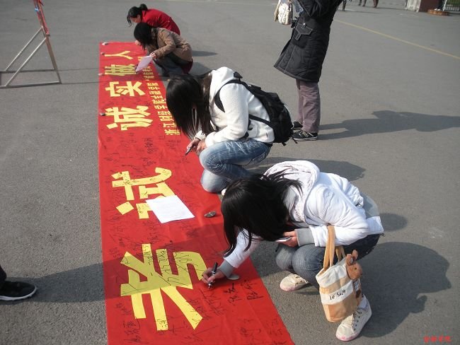 17日,yl6776永利集团分团委、学生会向全校同学发起诚信考试的倡议,号召更多的人加入到诚信考试的行列中来。各种各样的宣传方式吸引了过往的同学们,他们纷纷驻足,在印有“诚实做人,诚信考试”字样的横幅上郑重地签下了自己的姓名,这不仅仅是一个签名,更是一种自信,一种承诺,一种誓言——“实事求是,信守诚诺,认真学习,诚实考试,手握诚信,把握未来”。在活动结束后,这条承载着同学们诚信考试承诺的横幅挂在了文化长廊上,时刻警醒着同学们。
