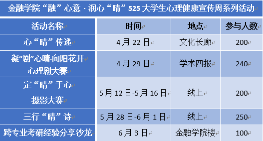 在525全国大学生心理健康宣传周来临之际,yl6776永利集团心理辅导站从四月底以来在全院范围内倾情推出“融”心意·润心“晴”525大学生心理健康宣传周系列活动陪伴大学生成长成才。学院领导高度重视,我院学生积极参与,从不同侧面展示了我院学生积极向上的精神风貌与生活态度,丰富了校园文化生活,现将我院组织参与的活动总结如下: