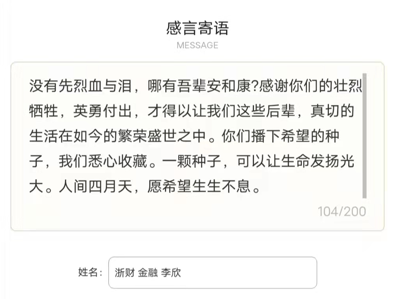 活动期间,学院团学骨干们自行前往浙江革命烈士纪念馆网站,为革命先烈献花、鞠躬。大家通过一张张英烈的照片,重读他们可歌可泣、令人动容的事迹,并留下自己的感言寄语。