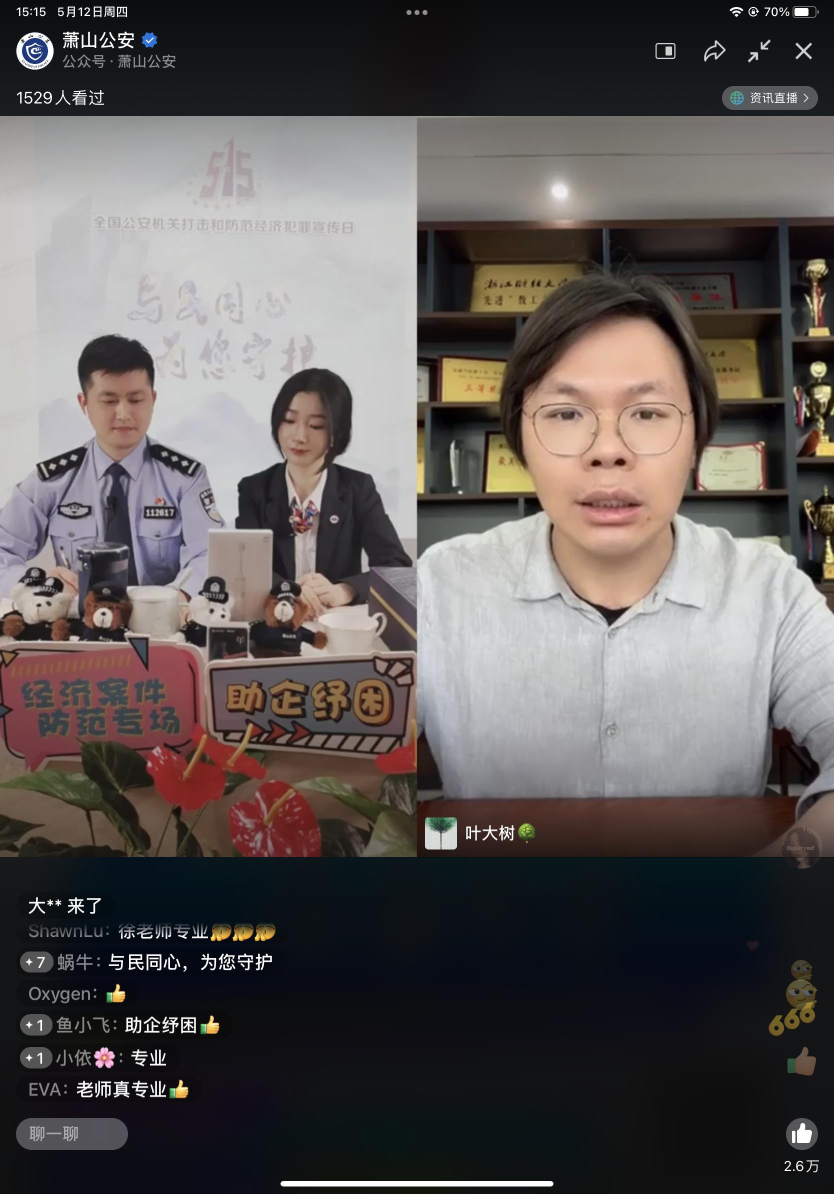 5月12日下午,yl6776永利集团纪委委员、教工第四党支部书记、投资系主任徐峰,萧山区公安分局经侦大队楼鹏飞,国信证券浙江分公司王轶玲等做客“萧山公安”直播间,畅谈经济犯罪防范,吸引了近2500人观看。