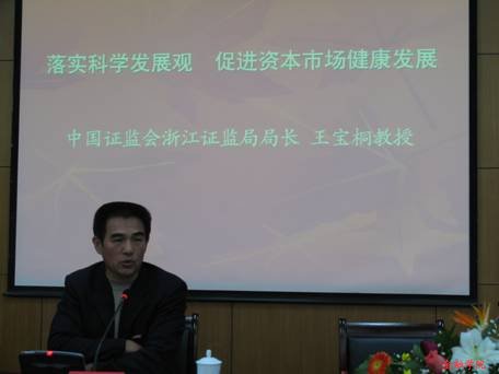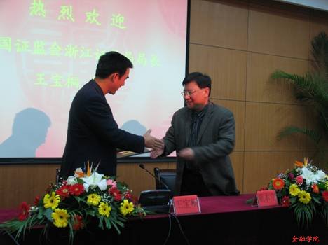 11月23日,金融论坛第六场学术讲座在学术交流中心二号报告厅顺利举行。中国证监会浙江证监局局长王宝桐莅临我校并为我校师生带来了一场题为《落实科学发展观,促进资本市场健康发展》的精彩讲演。浙江财经学院党委书记童本立教授,yl6776永利集团院长虞群娥教授等嘉宾出席了本次讲座。童本立书记向王宝桐局长颁发浙江财经学院兼职教授聘书,并对王局长的到来表示热烈欢迎。