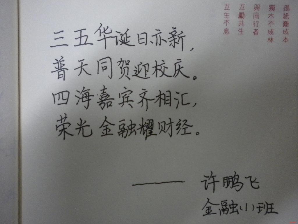 有个同学在活动后说:“虽然我们进入财院不久,但我们觉得这是一所充满活力和希望的学校,财院35周年校庆,有很多话想说,却不知怎么表达,“寄语传情,祝福接力”活动给了我们这个机会,让我们流露心声,完整地表达了我对母校的祝福。”