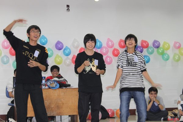 接着,主持人揭开了那层神秘面纱。每个人代表一张牌,相同花色的为一组,贴在胸前的为只有自己知道的暗牌,散乱地围坐在一起。书包游戏和情景剧模仿,极大地挑战了同学们的表演能力。更具挑战性的是下一轮的猜词游戏,其充分体现了游戏者突出的表现力和广泛的知识面。场上同学进行着紧张的比赛,场下观众的心也随之跌宕起伏。
