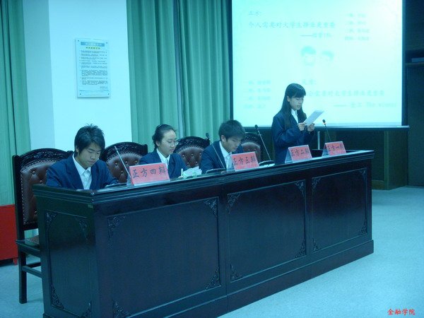 经过前两轮的激烈角逐,07信用管理的“信管1队”和07金融工程的“Winner”两支辩论队进入今晚的决赛。他们围绕“个人需要还是社会需要对大学生择业更重要”的辩题展开激烈的辩论。比赛过程中,双方辩手从容不迫,引经据典,在唇枪舌剑中表现地沉着冷静,阐引出于己方有利的事例,而对对方的漏洞予以反驳。精彩的攻辩和陈述赢得了台下观众的阵阵掌声。