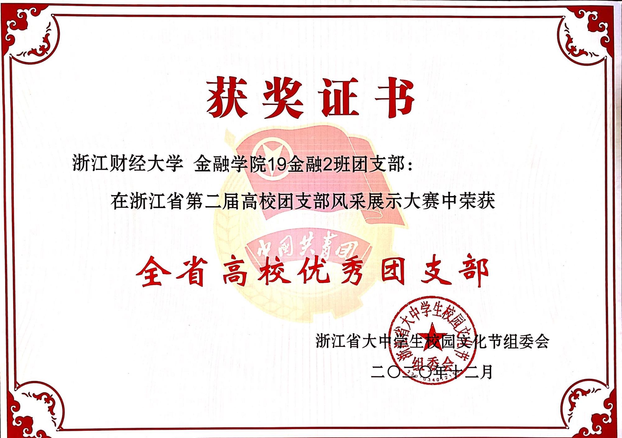 近日,由浙江省委宣传部、省文明办、团省委、省教育厅、省自然资源厅、省体育局、省学联共同主办的浙江省第二届高校团支部风采展示大赛评选结果正式揭晓,我院19金融2班团支部荣获“全省高校优秀团支部”荣誉称号。