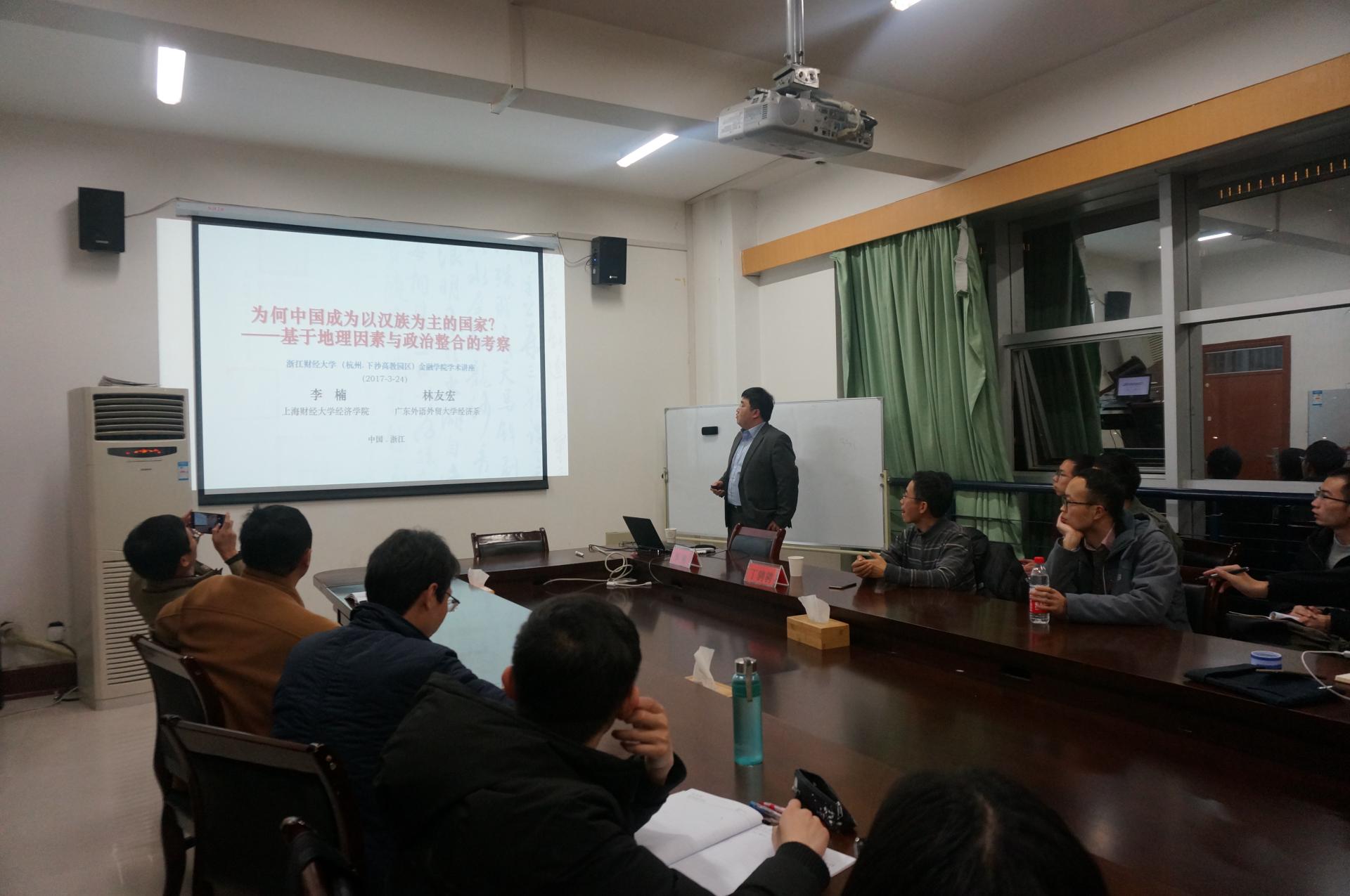 3月24日晚6:30在3号楼422室上海财经大学经济学院经济史副教授、上海财经大学讲席副教授、博士生导师李楠应邀作了题为“中国如何成为以汉族为主体的国家?基于地理环境与政治整合的考察”的学术报告。本次报告由永利集团丁骋骋教授主持,yl6776永利集团多名教授及研究生出席讲座。