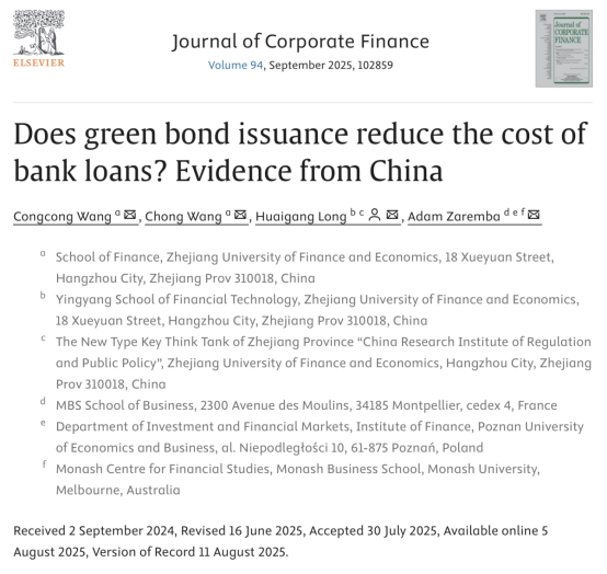 近日,我院王聪聪教授(第一作者)、王翀博士研究生和盈阳金融科技学院龙怀钢副教授(通讯作者),蒙彼利埃高等商学院副教授Adam Zaremba的合作论文“Does green bond issuance reduce the cost of bank loans? Evidence from China”于金融学领域权威学术期刊、ABS4星期刊,我校认定的外文一级A类SSCI期刊Journal of Corporate Finance上正式发表。
