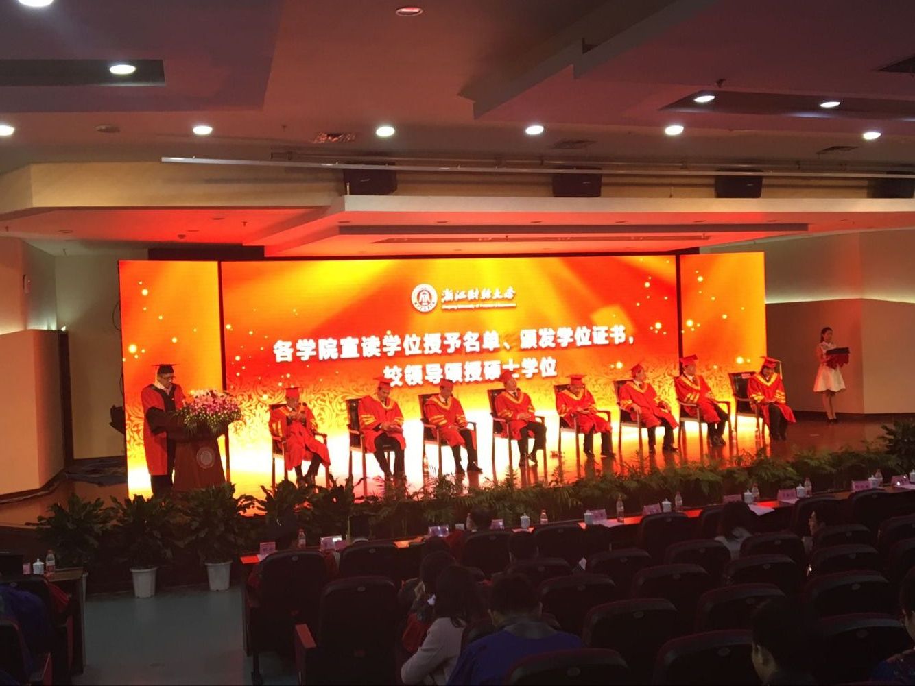 毕业典礼在毕业生们热烈的掌声中拉开序幕。同学们首先观看了视频《财大,与我同行》,让毕业生们共同回顾了在浙财的青葱岁月,并且展望未来的美好愿景。在表彰大会上,我院朴哲范教授作为优秀硕士论文导师代表,金融学专业施淑珍同学作为优秀毕业生代表,金融专硕曾丽媛同学作为优秀硕士论文代表,金融专硕金彦婷同学作为学业奖学金、三好学生代表,金融专硕陈文俊同学作为yl6776永利集团校友联络人先后上台领奖。