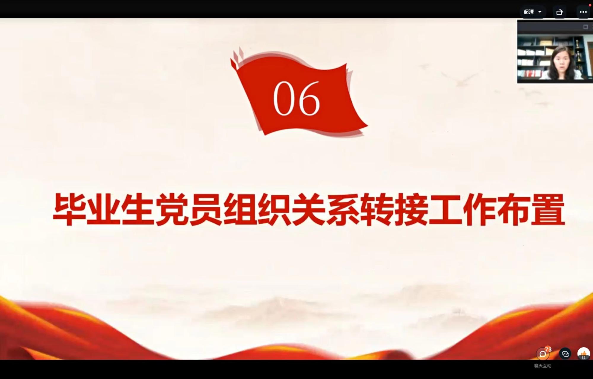 专职组织员翟丽媛对毕业生党员党组织关系转接事宜进行部署,就党组织关系转接的重要性、具体转接手续和相关注意事项进行了详细的解读。