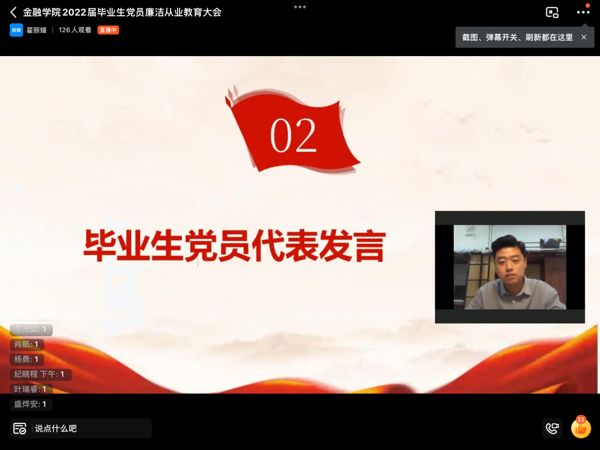 毕业生党员代表邱杰在会上发言,他号召全体毕业生党员坚定理想信念,不忘初心使命,严格遵纪守法,秉持正气,做人清白,不断用行动践行自己的庄严承诺,永葆共产党人的政治底色,为母校争光添彩。