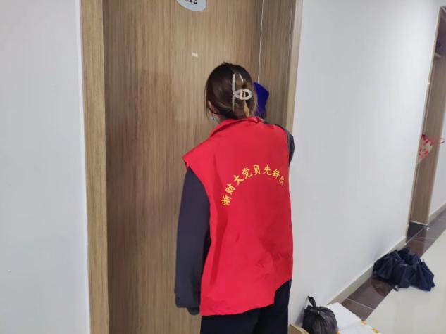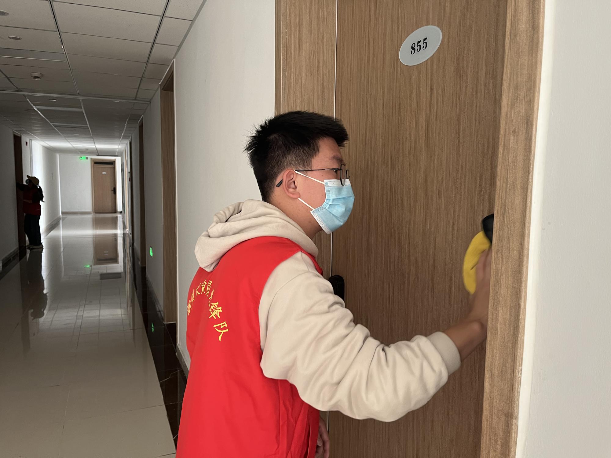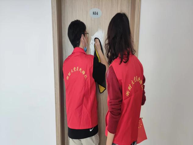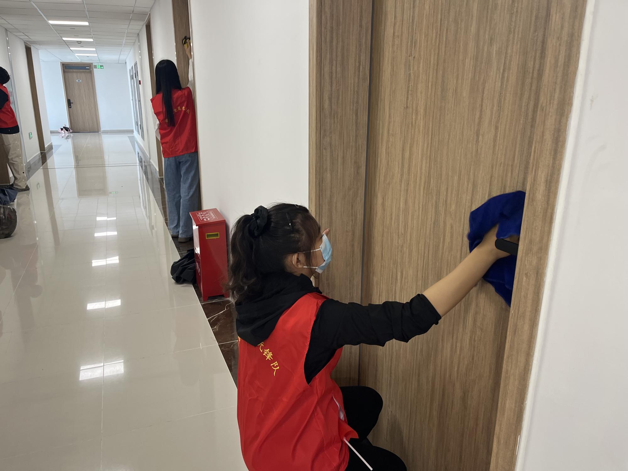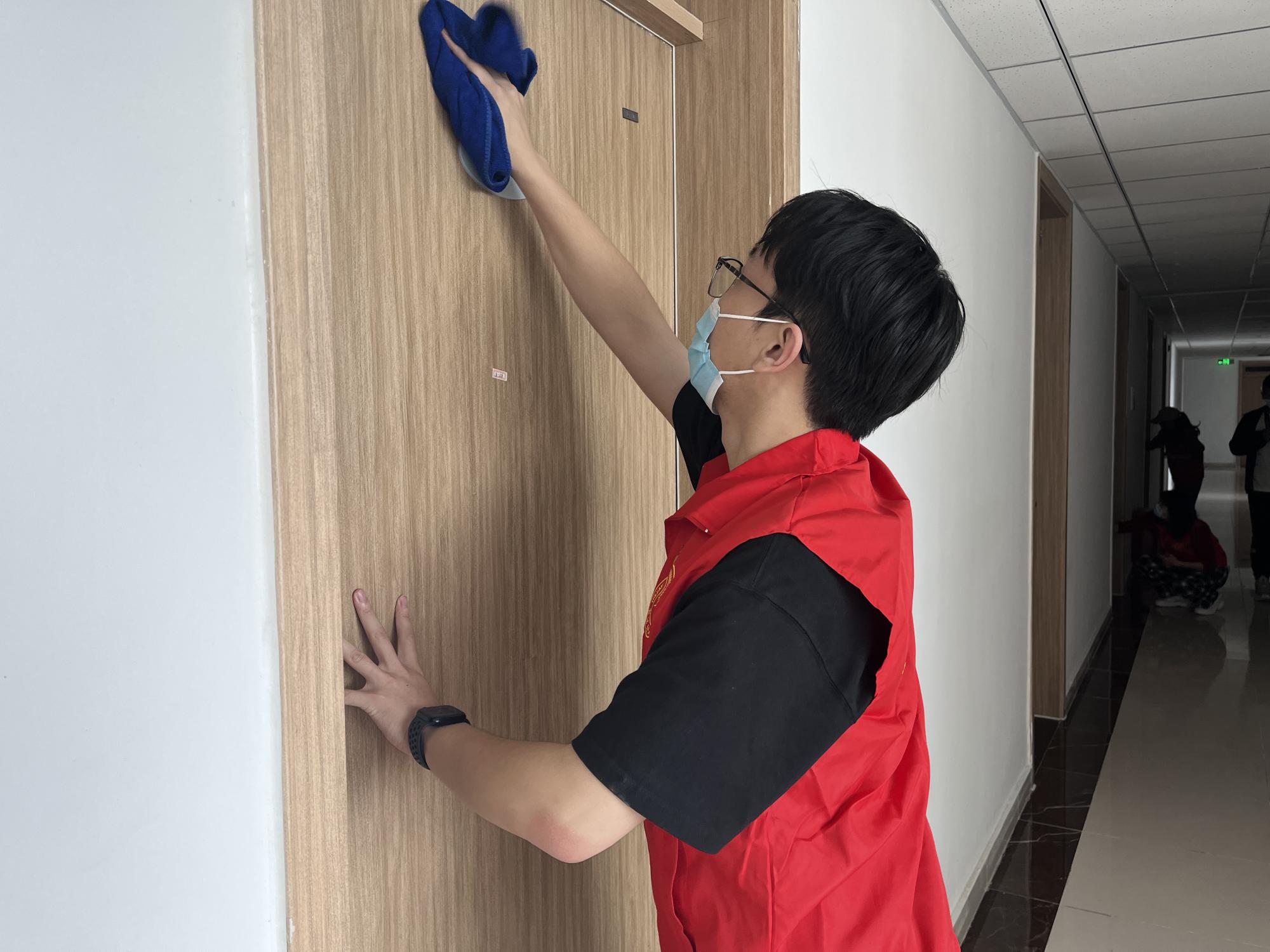 开幕式后,按照分配工作任务,我院师生党员志愿者集合领取相关清扫用品并有序前往园区6楼和8楼开展清洁寝室木门工作。师生党员们不怕苦、不怕累,精神抖擞、细致耐心的擦拭木门并清理杂物,整个志愿服务过程分工明确、井然有序,为更舒适卫生的园区环境建设贡献了自己的力量。