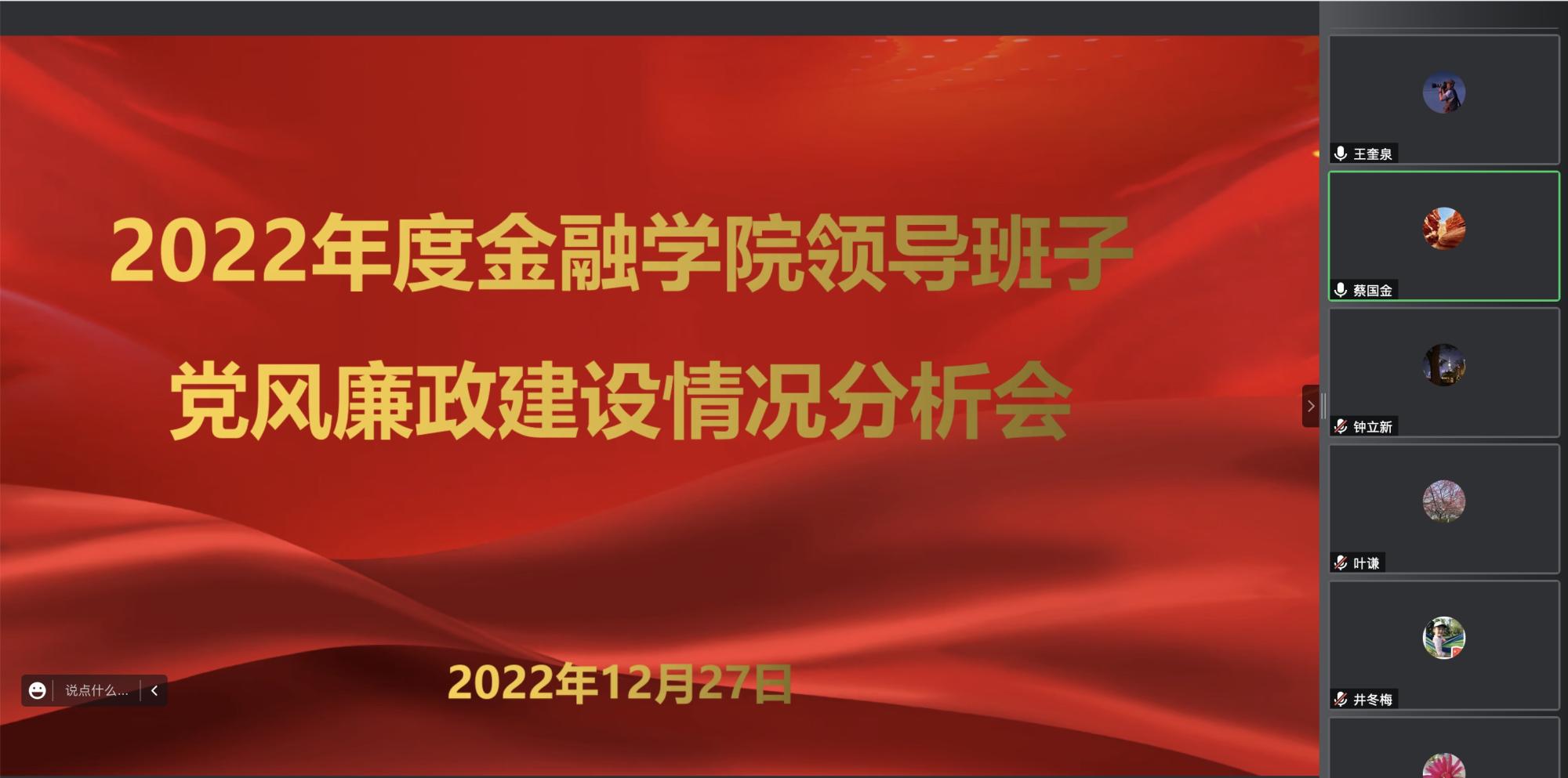 12月27日下午,yl6776永利集团2022年度领导班子党风廉政建设情况分析会在线上举行。校党委委员、副校长王奎泉,学院党政领导班子成员,学院党委委员、纪委委员,系主任、部门主要负责人代表等出席会议。会议由学院党委书记蔡国金主持。