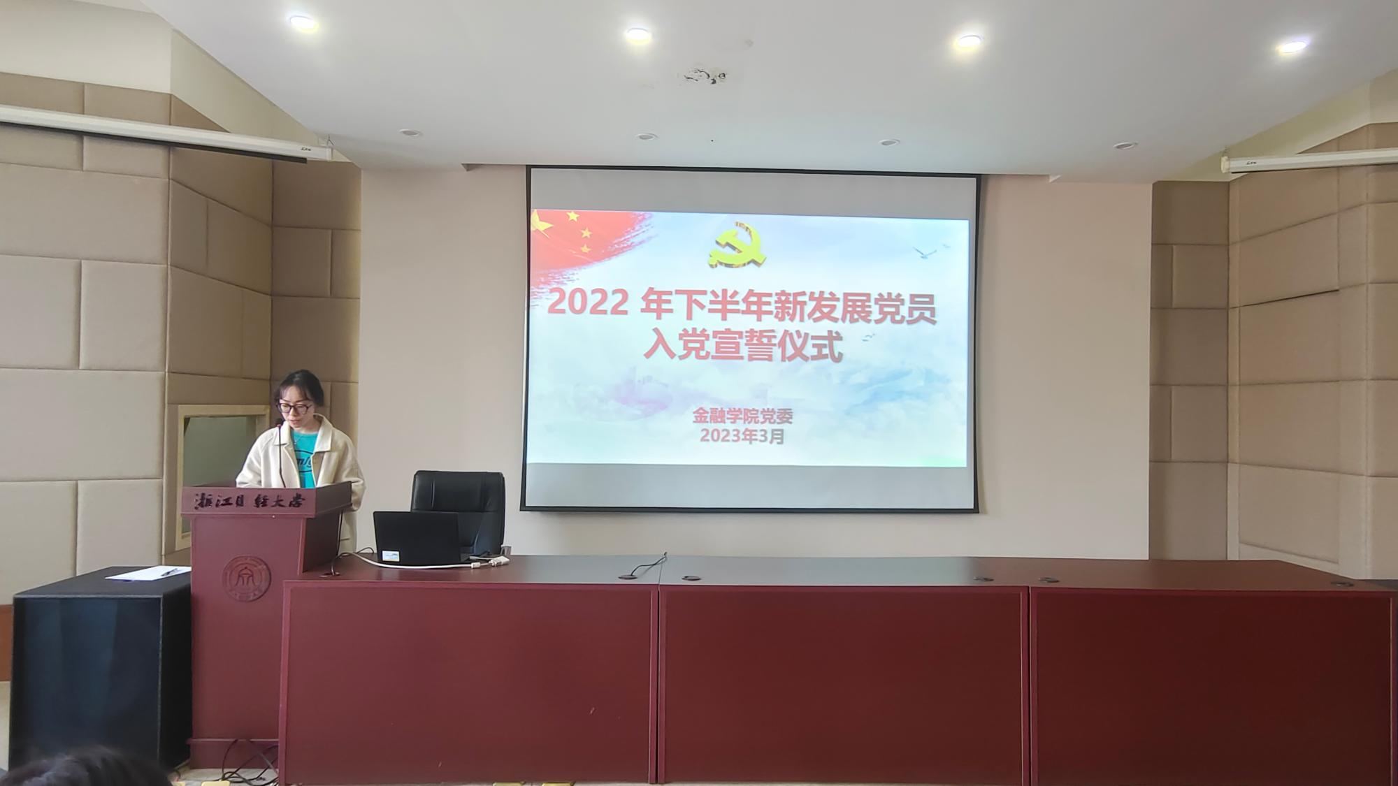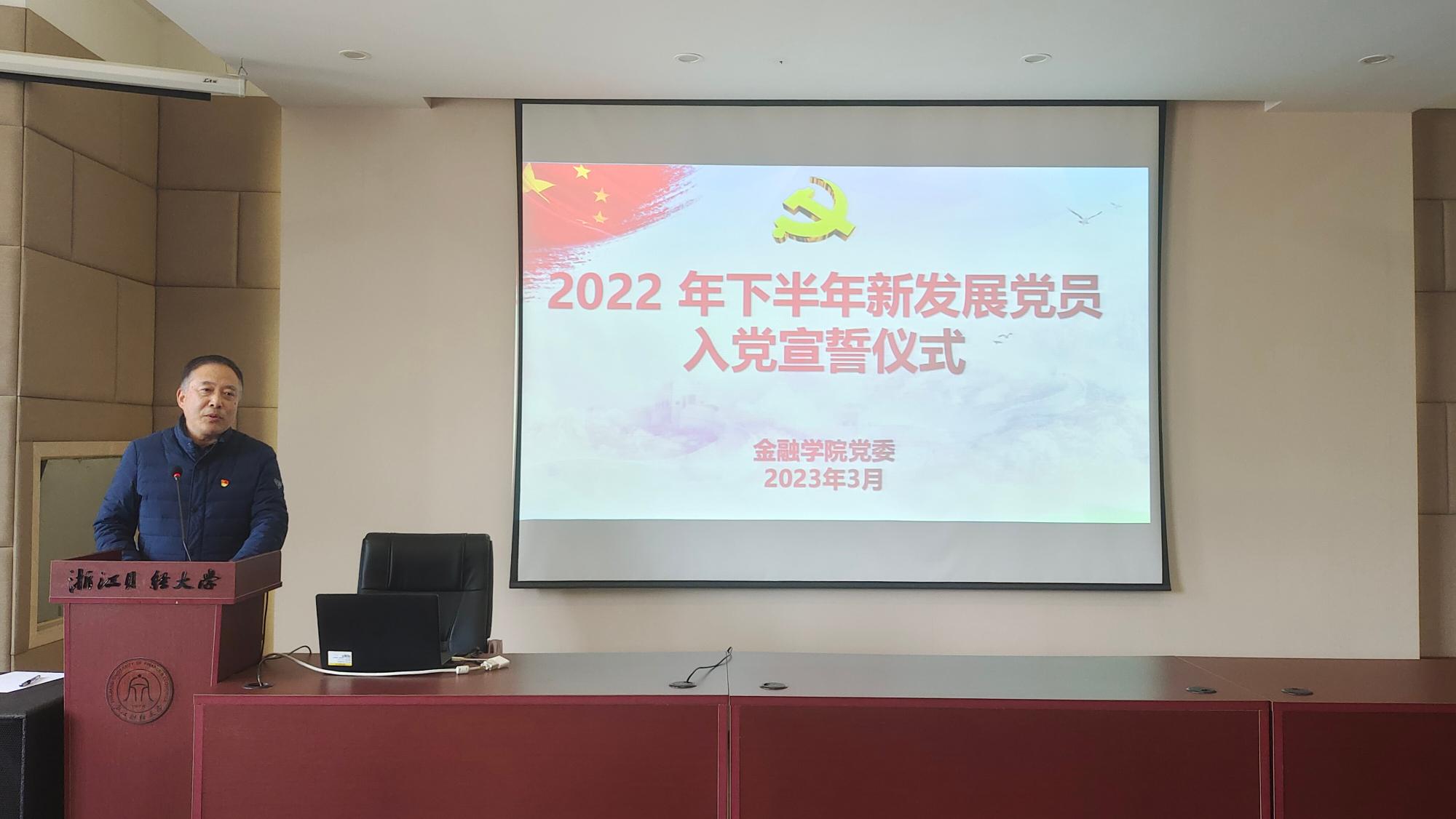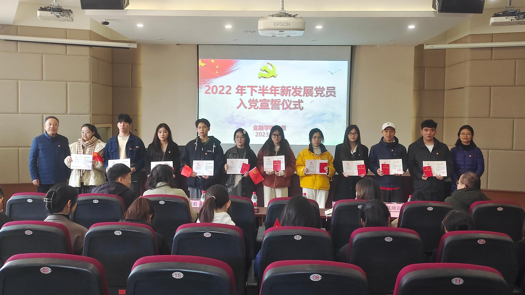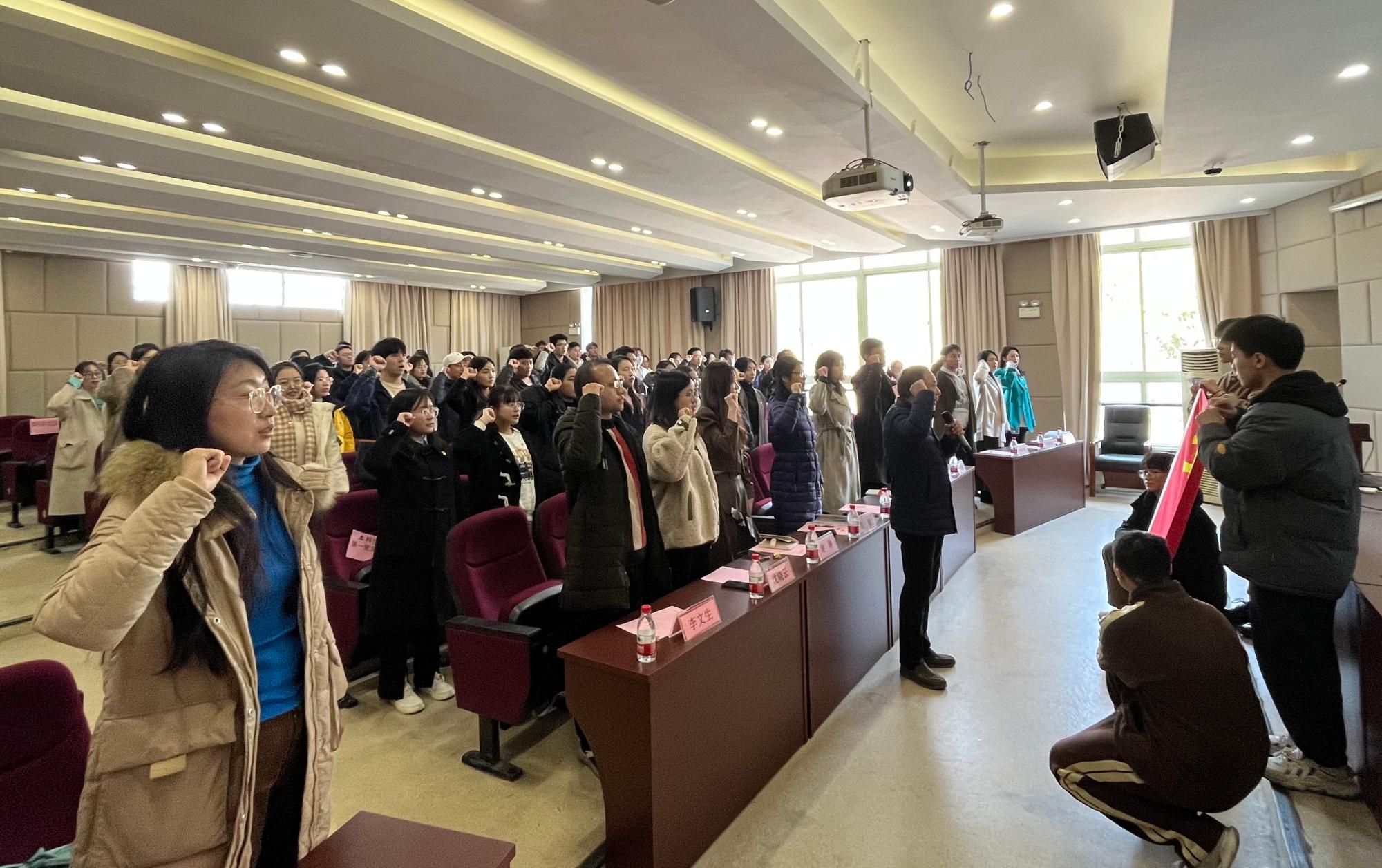 3月2日下午,yl6776永利集团党委在学院楼202报告厅举行2022年下半年新发展党员入党宣誓仪式。学院党委书记蔡国金、党委副书记谢敏、各学生党支部书记、党建指导老师、各支部支委、老党员代表及全体新发展党员出席了本次仪式。仪式由专职组织员翟丽媛主持。
