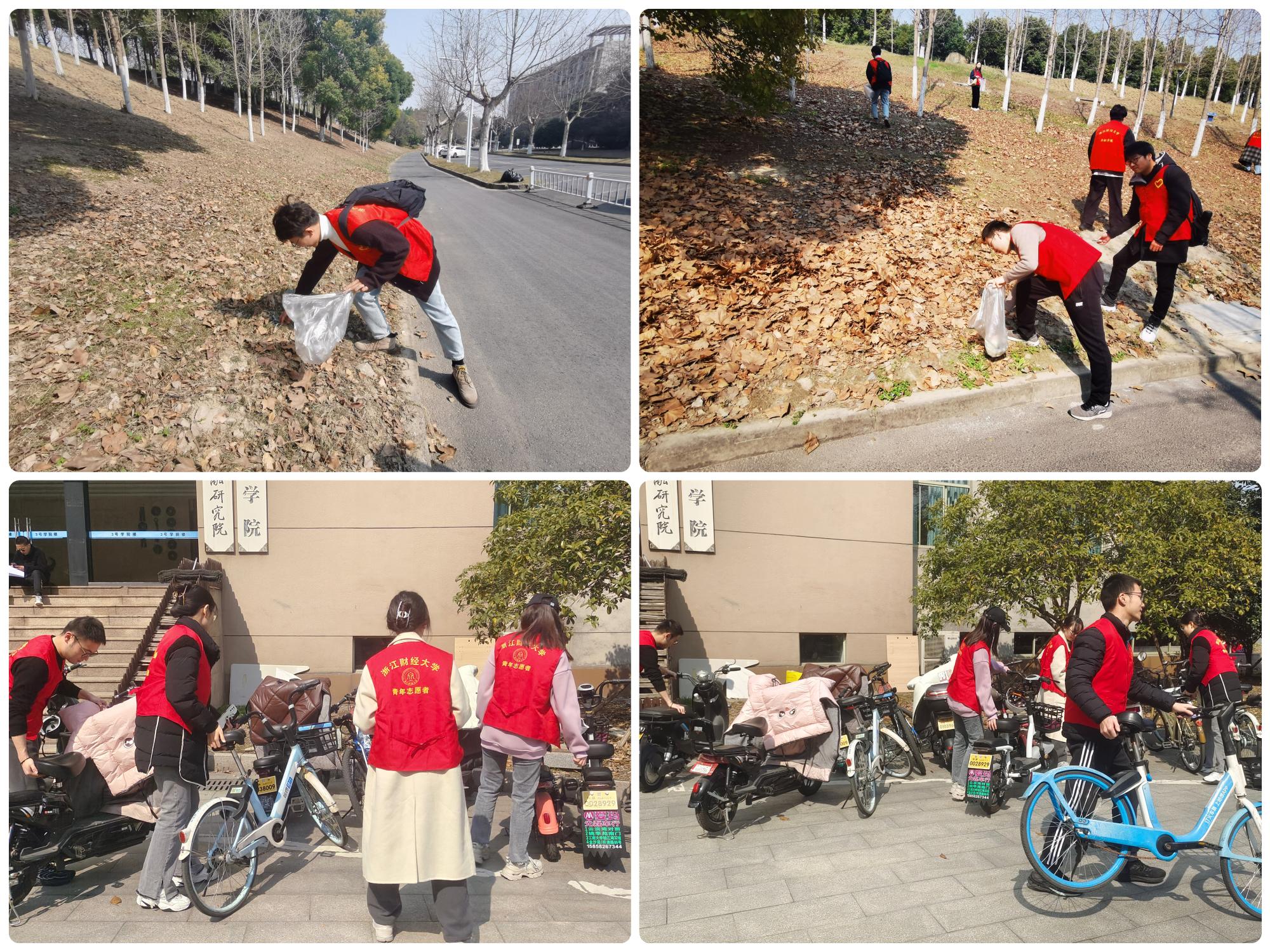 新党员们就地化身志愿者,通过对学院楼前、地下车库的非机动车整理摆放、对校园的环境进行清理等,大家用实际行动践行新时代的雷锋精神,美化了校园环境,倡导了文明理念,展现出青年党员带头不怕脏、不怕累、学雷锋我当先的的良好精神风貌,让雷锋精神在新时代绽放更加璀璨的光芒。