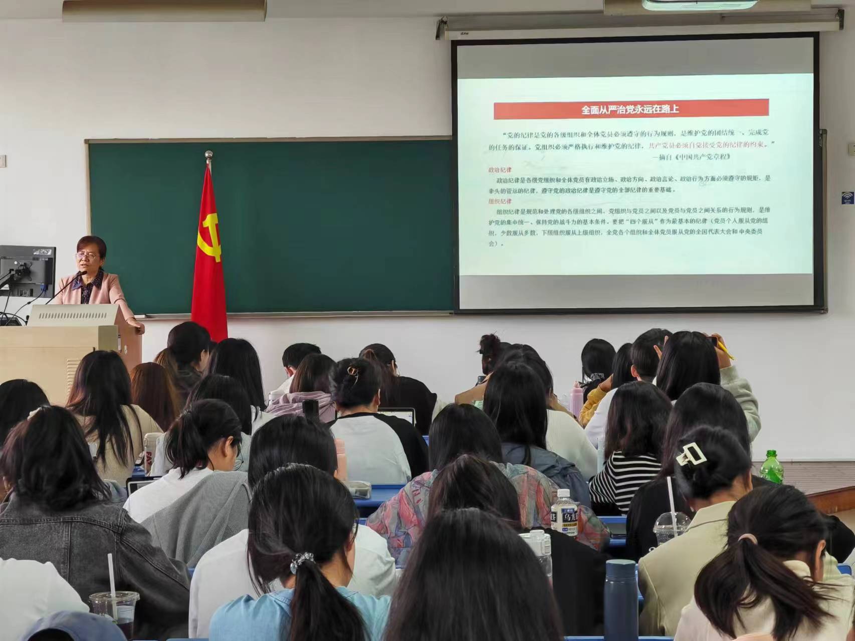 童玉玲以《从严治党永远在路上——学习解读<中国共产党纪律处分条例>(2023)》为主题,从《中国共产党纪律处分条例》(以下简称《条例》)修订的背景和主要条款出发,帮助大家深刻认识《条例》的重要意义,准确把握《条例》修订的主旨要义。近日,中共中央办公厅印发了《关于在全党开展党纪学习教育的通知》,为深入学习贯彻修订后的《条例》,自2024年4月至7月,在全党开展党纪学习教育。作为学生党员,须认真学习贯彻《条例》内容,切实做到学纪、知纪、明纪、守纪,搞清楚党的纪律规矩是什么,弄明白能干什么、不能干什么。