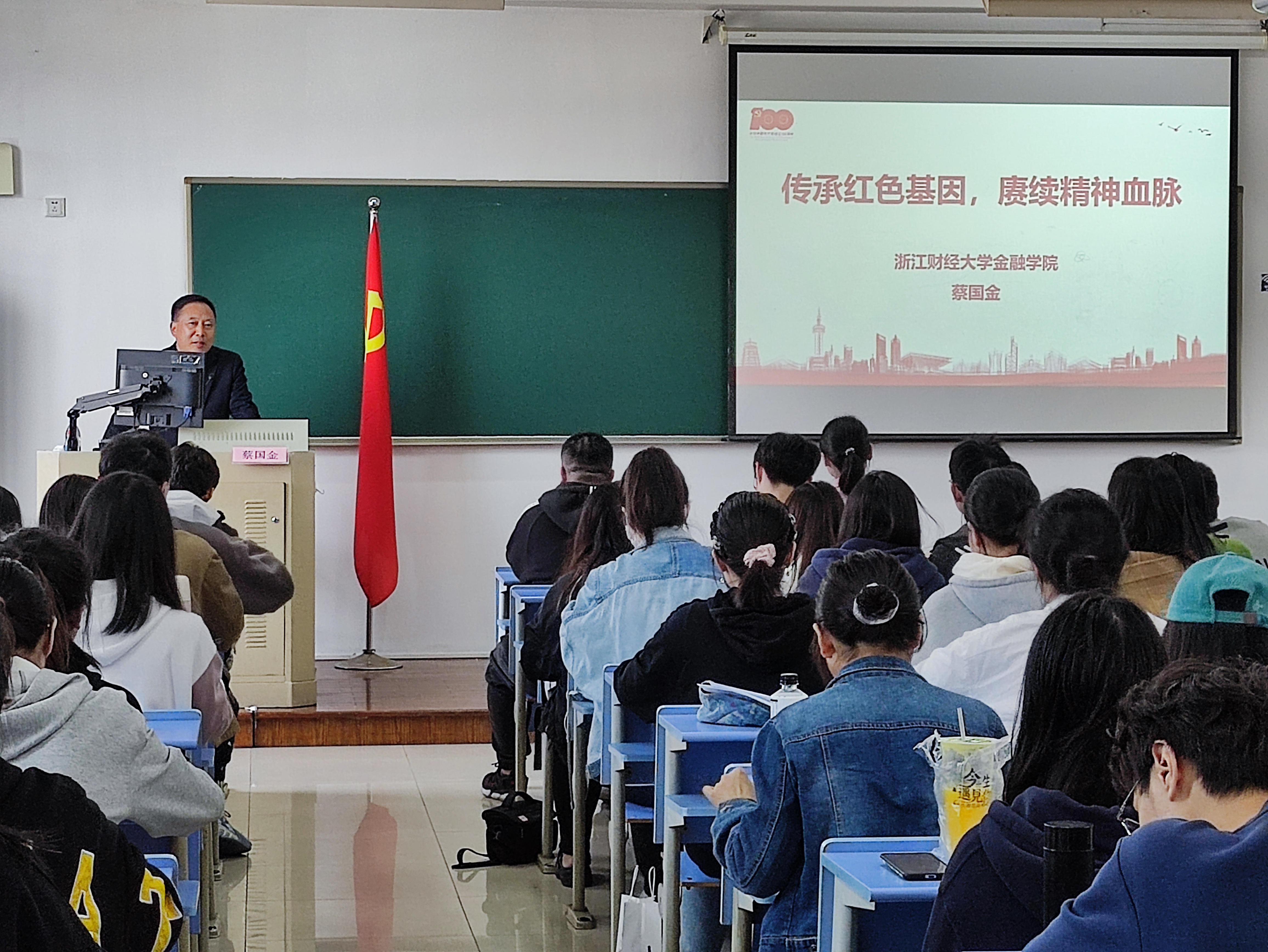 蔡国金以《传承红色基因,赓续精神血脉》为主题,阐述了红色精神的形成及其谱系、特征和时代价值。其中,通过历代领导人对红色精神的论述,我们了解到中华民族有一脉相承的精神追求,精神特质、精神脉络是中华民族在历史长河中生生不息、薪火相传、顽强发展的重要原因。因此,我们应认真学习伟大革命历程,继承和发扬红色精神财富,担当起时代的使命和责任,彰显和塑造新的时代精神。
