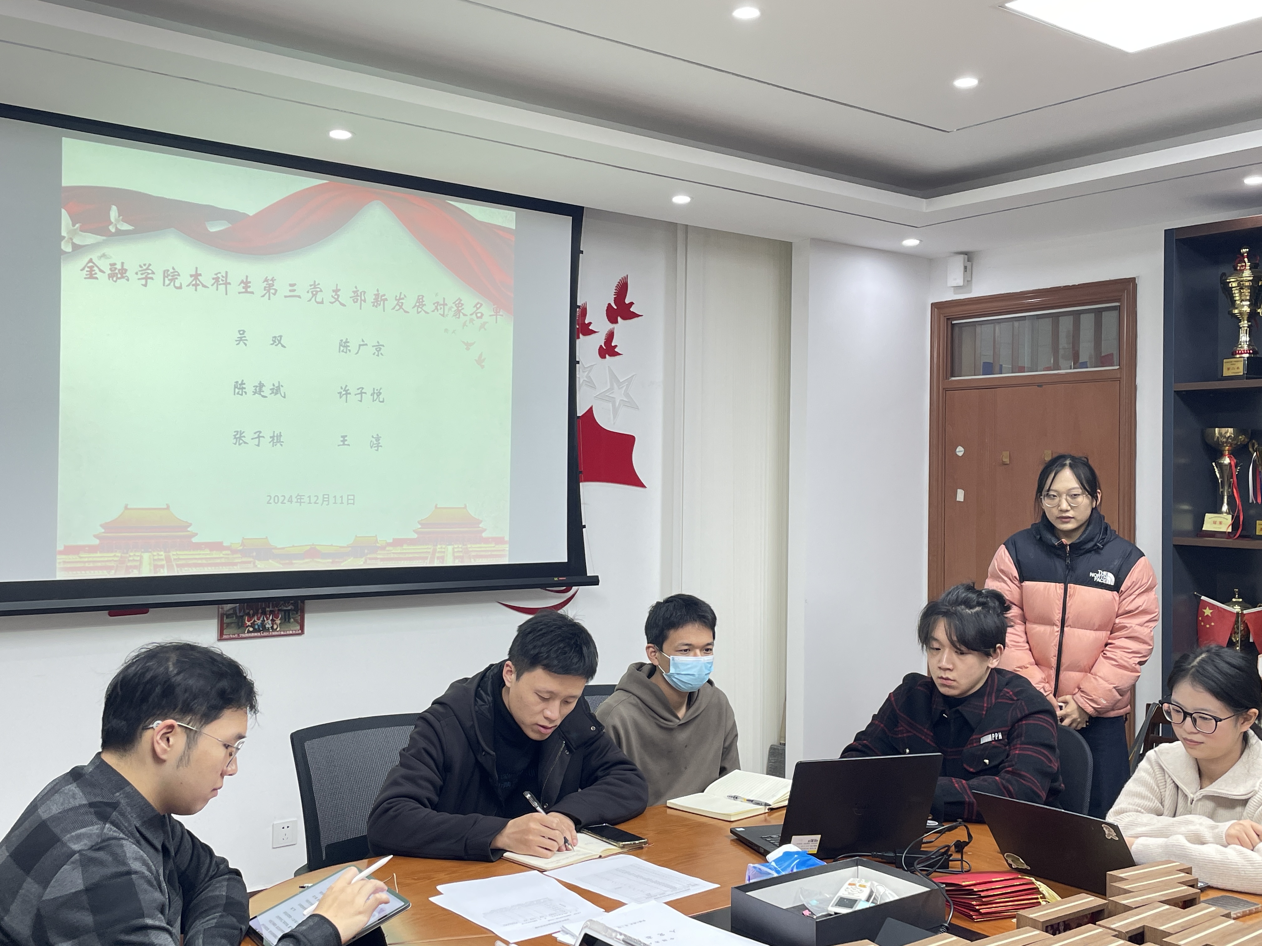 大会首项议程为党员发展大会,讨论关于接收吴双等6名发展对象为预备党员的议题。6位发展对象相继汇报自己从成为入党积极分子到发展对象期间的思想、工作和生活等方面的情况,随后其入党介绍人详细讲述了各位同志在发展期间的培养考察情况。经由参与本次支部党员大会且具表决权的全体正式党员无记名投票表决,根据有关组织原则,支部大会决定同意接收吴双等6名同志为中共预备党员。