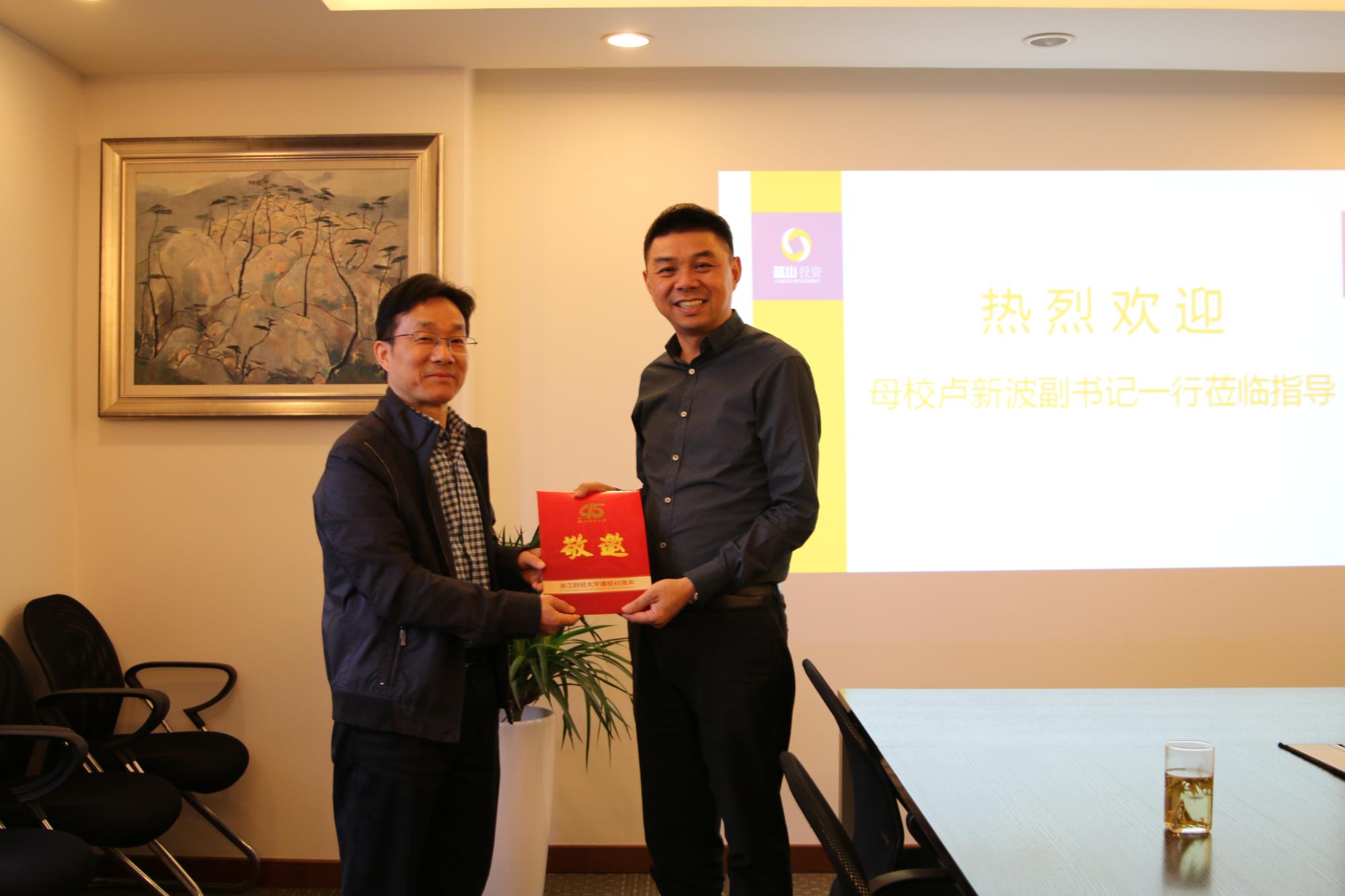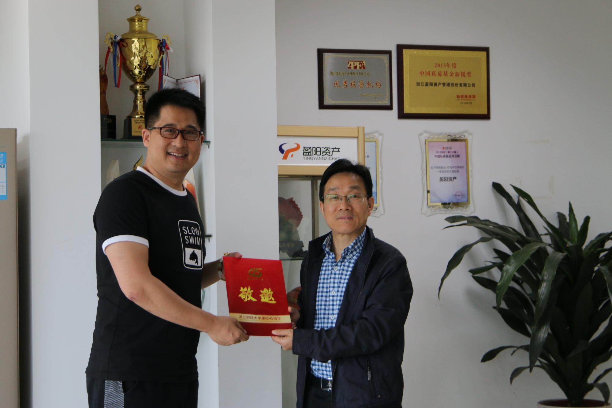 5月6日,校友总会副会长、校党委副书记卢新波在我院党委书记蔡国金,党委副书记叶秀等陪同下,走访看望了我院部分校友,与校友们进行了深入交流。此次走访,受到了蓝山投资有限公司创始人王晓明、浙江盈阳资产管理有限公司创始人楼栋、蓝山投资有限公司总经理王柳琳、浙江盈阳资产管理有限公司总经理孔繁岗、浙江盈阳资产管理有限公司基金经理陈浙平校友的热情欢迎。