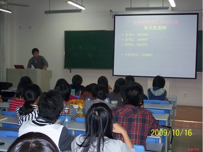 在近3个小时的讲座中,金锐学长以一位金融学会前辈的身份,为会员讲述了证券操作的一些基本概况,同时学长也将自己的宝贵经验与大家分享,使会员们更加全面地了解了中国证券市场的规则。而朱天民学长作为“涨停板敢死队”的一员,更是分享了其操作股票的方法心得,让全体会员受益匪浅。