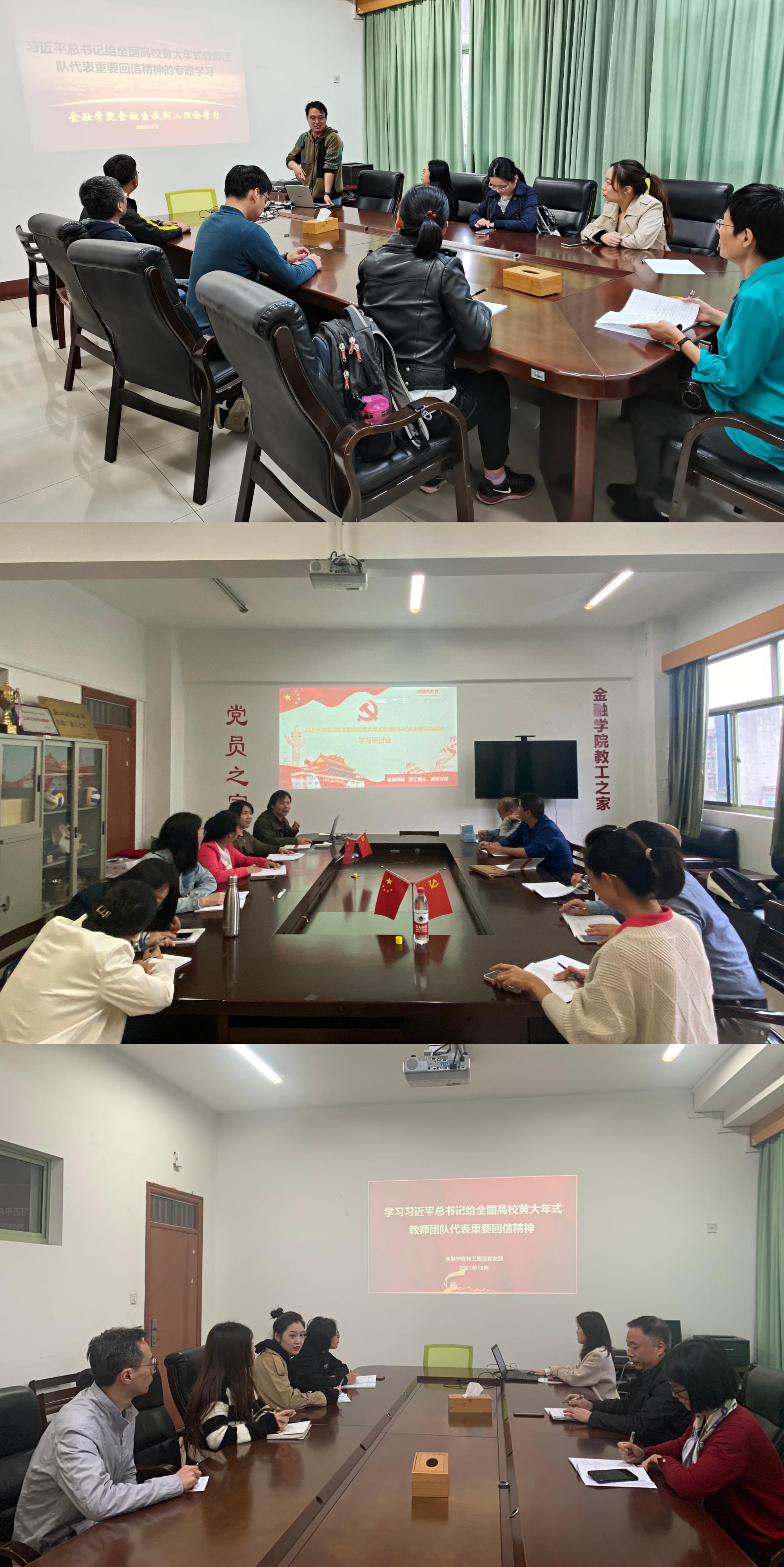 另外,学院各教工党支部均通过专题研讨会、观看《黄大年》电影、撰写学习心得体会等形式,组织党员老师、海外留学归国教师等开展了“学回信 强使命 勇担当”的主题党日活动。大家深入学习了习近平总书记给全国高校黄大年式教师团队代表的回信精神,纷纷为黄大年牺牲小我、成就大我的精神而感动,并围绕黄大年教授的感人事迹和习近平总书记的回信精神,结合党史学习教育展开了热烈讨论。并均表示在今后的工作中要以习近平新时代中国特色社会主义思想为指引,继承和发扬黄大年精神,牢固立德树人理念,爱党爱国爱校,胸怀大局,努力将“学为人师,行为世范”的好老师要求内化于心、外化于行,争做新时代的“四有”好老师,多为学校高质量发展建言献策。