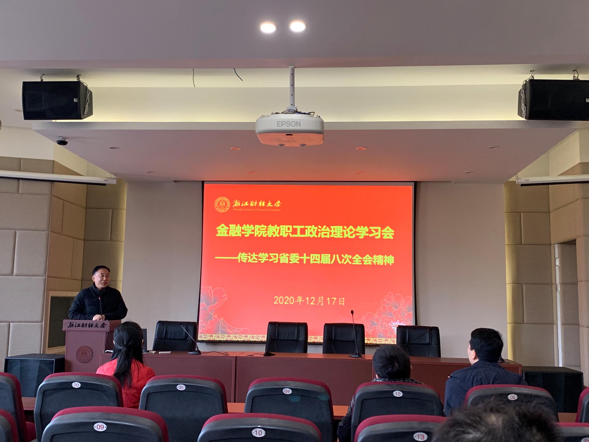 会上,蔡国金指出省委十四届八次全会是贯彻落实中央十九届五中全会精神所召开的一次极其重要的会议,对浙江省的建设发展具有里程碑意义。他指出学习贯彻省委十四届八次全会精神是当前一段时间各级党组织的重要政治任务,我们全院师生要紧扣“忠实践行‘八八战略’、奋力打造‘重要窗口’”的主题主线,坚决把思想和行动统一到中央和省委的部署要求上来。他强调要在学院的实际工作中加强学习精神,坚持明确“一条主线”,深刻领会全会核心要义,并做到三个结合:一是将学习与人才培养相结合,引导学生正确了解浙江建设发展大局;二是将学习与永利集团相结合,发挥我们的学科优势,贡献浙财金融力量;三是将学习与管理服务相结合,切实增强“窗口”意识,全面争先创优,为学院学术建设发展做出应有贡献。