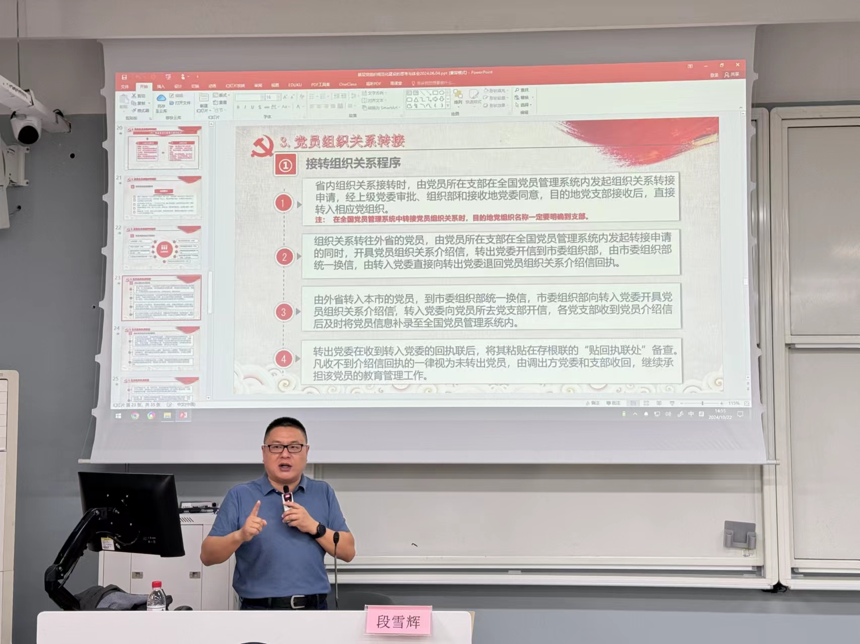 段雪辉老师以“规范化建设中国共产党”为题,从基层党务知识、规范化建设的重要意义,规范化建设的问题及规范化建设的举措四个方面对基层党组织规范化建设做了深入解读。段老师详细介绍了党委、党支部的主要职责,明确了党组织关系转接流程,教育督促学员们强化党员意识,严守党的纪律,争做合格党员。